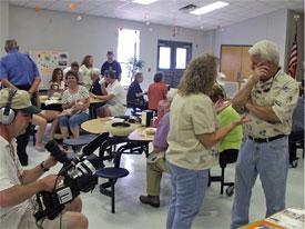 Producer and director Alan Barber talking to LaDonna Petter of Aquilla School at the Aquilla School Reunion in October 2005 with cinematographer Tom Chamberlain filming. |