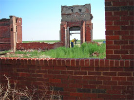 Producer and director Alan Barber filming the remains of Bula School near Three Way in the summer of 2006. Bula School closed in the '70s after it consolidated with Three Way School. It was subsequently destroyed by fire. Today the brick shell is all that remains. |