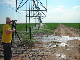 Producer and director Alan Barber filming cotton fields under irrigation near Whitharral, Texas in the summer of 2006. |