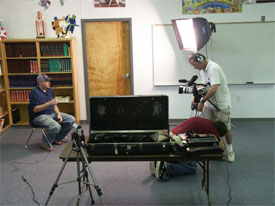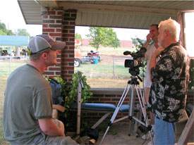 Cinematographer Tom Chamberlain filming Colter Snipes as he discusses the history of Aquilla School at the Aquilla School reunion in October 2005. |