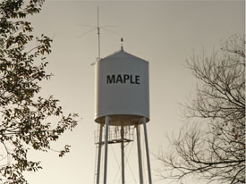 The water tower in Maple, Texas, the closest town to Three Way School. Today all that remains in Maple are a cotton gin, a filling station and a few houses. |